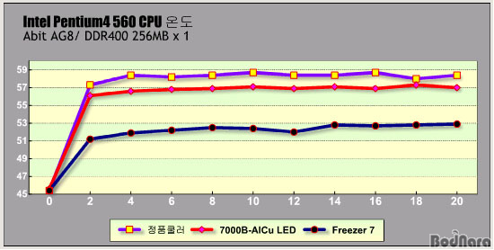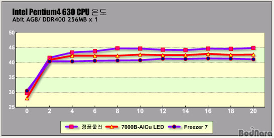 Freezer 7, 7000B-AlCu LED, ÀÎÅÚ Á¤Ç° Äð·¯¿Í ºñ±³Çϰí À©µµ¿ì ÁøÀÔ ÈÄ 20ºÐ µ¿¾È IDLE »óÅ·Π¿Âµµ ÆòÇü¿¡ À̸£±â¸¦ ±â´Ù¸®°í FULL LOAD¸¦ ½ÃÀÛÇÏ¿© 20ºÐ µ¿¾ÈÀÇ ¿Âµµ º¯È¸¦ Temp Master II µðÁöÅÐ ¿Âµµ°è¸¦ ÀÌ¿ëÇÏ¿© ÃøÁ¤ÇÏ¿´´Ù. À̹ø¿¡´Â Å×½ºÆ® ¹æ¹ýÀ» ¾à°£ ´Þ¸®ÇÏ¿© ÇϳªÀÇ Ä𷯸¦ ±³Ã¼ÇÏ´Â ½Ã°£À» 20ºÐÀ¸·Î ¼³Á¤ÇÏ¿© CPU³ª ¸ÞÀκ¸µåÀÇ ¿Âµµ°¡ ±×¸® ¸¹ÀÌ Ç϶ôµÇÁö ¾ÊÀº ½ÃÁ¡¿¡¼ ¾ó¸¶³ª ÁÁÀº ¼º´ÉÀ» º¸¿©ÁÖ´ÂÁö¸¦ ÃøÁ¤ÇÏ¿© º¸¾Ò´Ù.
