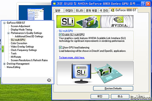 ¸ÞÀκ¸µå Ĩ¼Â ÀúÇ× °³Á¶¸¦ ÅëÇØ Á¤»óÀûÀ¸·Î nForce4 SLI·Î ÀνÄÇÏ¿´°í, µð½ºÇ÷¹ÀÌ µî·Ï Á¤º¸¿¡¼­µµ SLI ¿É¼ÇÀÌ È°¼ºÈ­µÇ¾î PCI Express 16X ½½·Ô¿¡ ¼³Ä¡ÇÑ µà¾ó GPU ±×·¡ÇÈ Ä«µåÀÎ GV-3D1-68GTµµ Á¤»óÀûÀ¸·Î SLI ±¸¼ºÀ» ÇÒ ¼ö ÀÖ¾ú´Ù.