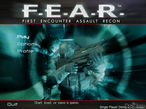 F.E.A.R.¸¦ ½ÇÇàÇÏ¸é ³ª¿À´Â È­¸é. Play ¸Þ´º¿Í Option, ±×¸®°í Á¦ÀÛÁø Á¤º¸¸¦ ¾Ë ¼ö ÀÖ´Â Profile·Î ±¸¼ºµÇ¾î ÀÖ´Ù.