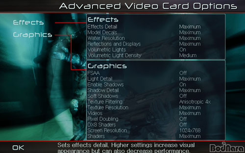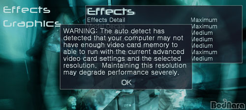 F.E.A.R.¿¡¼­´Â ±×·¡ÇÈ Ä«µå ¸Þ¸ð¸®·Î 256MB¸¦ ±ÇÀåÇϰí ÀÖ´Ù. 128MB ÀÌÇÏÀÇ ¸Þ¸ð¸®°¡ »ç¿ëµÈ ±×·¡ÇÈ Ä«µå¿¡¼­´Â À§¿Í °°ÀÌ °íÇØ»óµµ³ª ÀϺΠ±×·¡ÇÈ ¿É¼ÇÀ» »ç¿ëÇÏ±â ¾î·Æ´Ù´Â ¸Þ½ÃÁö°¡ Ãâ·ÂµÈ´Ù.