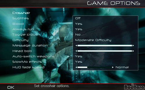 °ÔÀÓ Ç÷¹ÀÌ ¿É¼ÇÀ¸·Î ±¸¼ºµÈ Game Option¿¡¼­´Â Á¶ÁØÁ¡ÀÇ ¸ð¾çÀ̳ª µ¿¿µ»ó¿¡¼­ ´ë»ç ³»¿ëÀ» ÀÚ¸·À¸·Î Ç¥½ÃÇØÁÖ´Â Subtitles(¿µ¾î·Î Ç¥½ÃµÊ), ÇǸ¦ º¸¿©ÁÖ´Â Blood, °ÔÀÓ ³­À̵µ¸¦ Á¶ÀýÇÏ´Â Difficulty, ±×¸®°í °ÔÀÓ¿¡¼­ ½½·Î¿ì ¸ð¼Ç È¿°úÀÇ »ç¿ë À¯¹«¸¦ °áÁ¤ÇÏ´Â SlowMo Effect µîÀ¸·Î ±¸¼ºµÇ¾î ÀÖ´Ù.