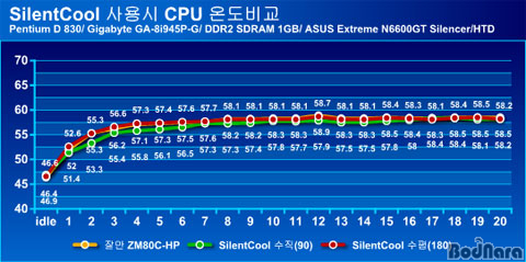 À̹ø¿¡´Â CPUÀÇ ¿Âµµ¸¦ °¢°¢ ºñ±³ÇÏ¿© º¸¾Ò´Âµ¥ ¿¹»ó°ú´Â ´Þ¸® CPUÀÇ ¿ÂµµÂ÷´Â °ÅÀÇ ¾ø¾ú´Ù°í ÇØµµ °ú¾ðÀÌ ¾Æ´Ï´Ù. ¾Õ¼­µµ ¾ð±ÞÇÏ¿´µíÀÌ SilentCoolÀ» 90µµ·Î ¼³Ä¡ÇÏ¿´À» °æ¿ì CPUÀÇ ¿Âµµ°¡ ¿ÀÈ÷·Á »ó½ÂÇÒ °ÍÀ¸·Î ¿¹»óÇÒ ¼ö ÀÖÀ¸³ª ÈĸéÆÒ¿¡ ¿ÀÈ÷·Á °¡±õ±â ¶§¹®¿¡ CPU Äð·¯·Î À¯ÀԵǴ ³»ºÎ °ø±â°¡ CPUÀÇ ¿Âµµ¿¡ Å©°Ô ¿µÇâÀ» ¹ÌÄ¡Áö ¾Ê´Â ´Ù´Â °ÍÀ» ¾Ë ¼ö ÀÖ´Ù.
