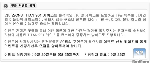 TITAN 901Àº ¸®´õ½º CNS¿¡¼­ ÄÉÀ̽º¸¸ ¼±º¸À̴ Á¦Ç°À¸·Î´Â óÀ½ÀÌ´Ù. ¶§¹®¿¡ Àú·ÅÇÏ°í ¸¹ÀÌ ÆÈ¸®´Â ¸ðµ¨º¸´Ù´Â µ¶Æ¯ÇÏ°í ºñ½Ñ Á¦Ç°À¸·Î ÀÏ´Ü "¸®´õ½º CNS ÄÉÀ̽º"¸¦ º¸´Ù ³Î¸® ¾Ë¸®±â À§ÇÑ ÀÓ¹«¸¦ ¶è Á¦Ç°À¸·Î Ç®À̵ȴÙ. ¹°·Ð RAIDMAX¿¡´Â TITAN 901 »Ó¸¸ ¾Æ´Ï¶ó ´Ù¾çÇÑ µðÀÚÀÎÀÇ °ÔÀÌ¹Ö ÄÉÀ̽ºµéµµ ÀÖÀ¸³ª, TITAN 901ÀÇ ¼ºÀû¿¡ µû¶ó À̵鵵 ±¸°æÇÒ Àְųª ¶Ç´Â º¸´Ù Àú·ÅÇÑ ´Ù¸¥ Á¦Á¶»çÀÇ ÄÉÀ̽º·Î ´ëüµÉ ¼ö ÀÖ´Ù.