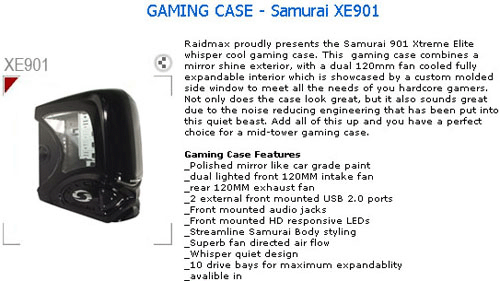 TITAN 901 ÄÉÀ̽ºµµ ȨÆäÀÌÁö¿¡¼­´Â Samurai XE901À̶ó´Â À̸§À¸·Î ¼Ò°³µÇ°í ÀÖ´Ù. ±×·¯³ª RAIDMAX´Â OEM(ÁÖ¹®ÀÚ »óÇ¥ ºÎÂø »ý»ê ¹æ½Ä)À¸·Îµµ Á¦Ç°À» ³³Ç°ÇϹǷÎ, ¸®´õ½º CNS¸¦ ÅëÇØ °ø±ÞµÇ´Â TITAN 901µµ ÀÌ·± ÀÌÀ¯·Î ÀÎÇØ »ç¹«¶óÀÌ XE901À̶ó´Â À̸§À» ¹ö¸®°Ô µÈ °ÍÀÌ´Ù.