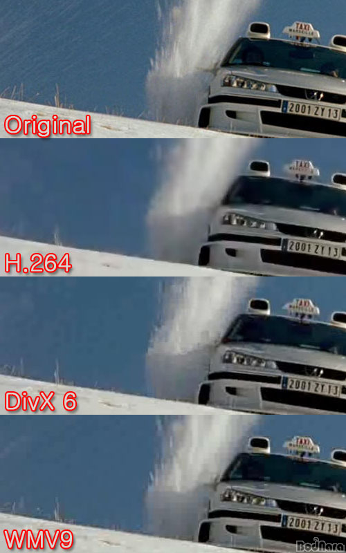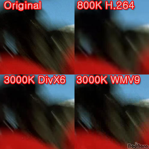 ¿øº»ÀÇ ÇØ»ó·ÂÀ» Èä³»³»±â¿¡´Â 800Kbps´Â ºñÆ®·¹ÀÌÆ®°¡ ¸¹ÀÌ ºÎÁ·ÇÏ´Ù. H.264 ÄÚµ¦À¸·Î ÀÎÄÚµù µÈ °á°ú¹°ÀÇ Æ¯¼ºÀº ±ïµÎ±â Çȼ¿ÀÌ »ý±âÁö ¾Ê´Â´Ù´Â Á¡ÀÌ´Ù. ´«ÀÌ Æ¢¾î¿À¸¥ ºÎºÐÀ» º¸¸é ¿øº¸¿¡ ºñÇØ È帮°Ô Ç¥Çö µÇ¾ùÁö¸¸, °°Àº ºñÆ®·¹ÀÌÆ®¿¡¼­ DivX6³ª WMV9Àº ±ïµÎ±â Çȼ¿ÀÌ ¸¹ÀÌ »ý±â´Â °Í¿¡ ºñÇÏ¸é ¾×Á¤ Å©±â°¡ Á¦ÇÑµÈ ¸ð¹ÙÀÏ ±â±â¿¡¼­´Â ºñ±³Àû º¸±â ÁÁÀº °á°ú¹°À» º¸¿©ÁÙ °ÍÀ¸·Î ¿¹»óÇØº¼ ¼ö ÀÖ´Ù. ´«¹ßÀÇ Ç¥ÇöÀº ¸¹ÀÌ ¹¶°³Á³Áö¸¸, ¹øÈ£ÆÇÀÇ °¡µ¶¼ºÀº ´Ù¸¥ µÎ ÄÚµ¦¿¡ ºñÇØ ³ª»ÚÁö ¾ÊÀº ¼öÁØÀÌ´Ù.
