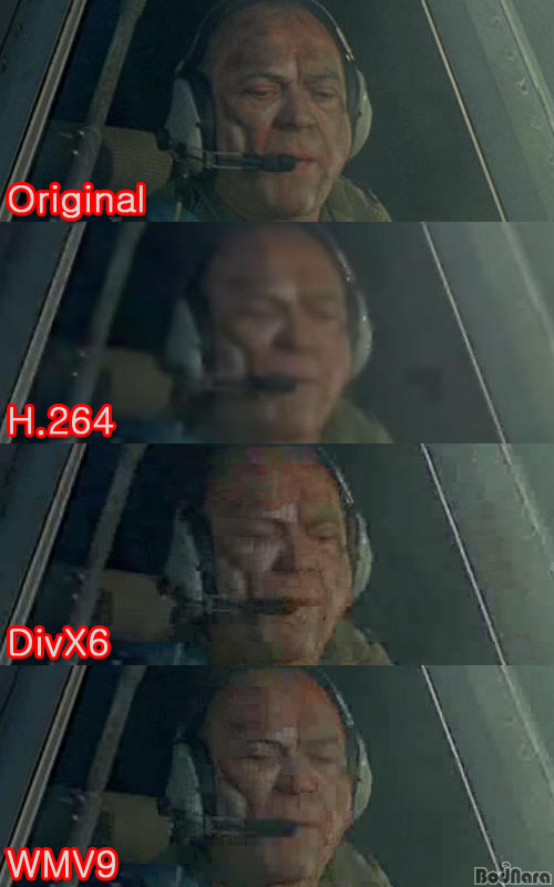 ³·Àº ºñÆ®·¹ÀÌÆ®´Â »ç¶÷ ¾ó±¼À» À§¿Í °°ÀÌ ±«¹°·Î ¸¸µé¾î¹ö¸± ¼öµµ ÀÖ´Ù. H.264´Â À̹ø¿¡µµ ´ëüÀûÀ¸·Î È帮°Ô ó¸®ÇÏ´Â ¸ð½ÀÀ» º¸¿©Áá´Ù. ¾ó±¼ÀÇ °æ¿ì ¿øº»¿¡ ºñÇØ¼­´Â ¸¹ÀÌ Èå·ÁÁ® º¸±â ÁÁÁö ¾ÊÁö¸¸, DivX6ÀÇ °á°ú¹°º¸´Ù´Â ³´´Ù. À̹ø »ùÇÿ¡¼­´Â ºñ·Ï ±ïµÎ±â´Â Á³Áö¸¸ WMV9ÀÌ °¡Àå ¾ó±¼ÀÇ µðÅ×ÀÏÀ» Àß »ì¸®°í ÀÖ´Ù. ¾ó±¼ ¿À¸¥ÂÊ¿¡ »ç¼±ÀÌ Àִµ¥ »ç¼±ÀÇ µðÅ×ÀÏÀº H.264°¡ °¡Àå ¿ì¼öÇÏ´Ù.