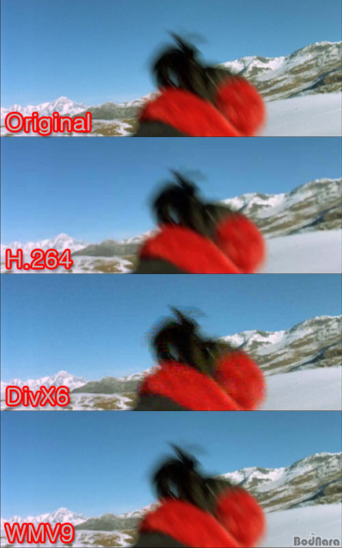 ±²ÀåÈ÷ ºü¸£°Ô ¿òÁ÷ÀÌ´Â Àå¸éÀε¥, ¿©±â¼­ DivX6ÀÇ 1-Pass CBR °á°ú¹°ÀÌ »ó´çÈ÷ ÁÁÁö ¸øÇÏ´Ù. 2-Pass VBR ÀÎÄÚµù¿¡¼­´Â ÁÁÀº °á°ú¸¦ º¸¿©ÁÖ´Â DivX6Áö¸¸, ¶§¿¡ µû¶ó¼­ Ä¡¸íÀûÀÎ ¾àÁ¡ÀÌ ÀÖ´Â °ÍÀÌ´Ù. ´ë½Å ¹è°æÀÎ »êÀÇ µðÅ×ÀÏ¿¡¼­´Â DivX6°¡ H.264º¸´Ù Á» ´õ ÁÁ¾Ò°í, WMV9´Â Æò±ÕÀûÀ¸·Î ÁÁÀº ¸ð½ÀÀ̱ä ÇÏÁö¸¸ ºí·°µéÀÌ »ý±â´Â °ÍÀº ÇÇÇÒ ¼ö ¾ø¾ú´Ù.