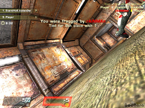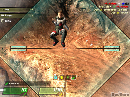 Quake4´Â ¸ÖƼ Ç÷¹ÀÌÀÇ Frame Rate¸¦ 60fps·Î °íÁ¤Çϰí Àִµ¥ ÀÌ´Â Quake3¿¡¼­ ÇÁ·¹ÀÓ Â÷À̸¦ ÀÌ¿ëÇÏ¿© ÀϹæÀûÀÎ °ø°ÝÀ» ÆîÄ¡´ø °ÍÀ» ¹æÁöÇϱâ À§Çؼ­¶ó°í ÇÑ´Ù. (À§ÀÇ È­¸éÀº ÇÊÀÚ°¡ Quake3 Ç÷¹ÀÌ ½ÃÀý¿¡ ÀÚÁÖ ½á¸Ô´ø ³²µéÀÌ ½Î¿ï ¶§ ¸ô·¡ µÞÅë¼öÄ¡±â¸¦ ½ÃµµÇÏ´Â Àå¸éÀÌ´Ù)