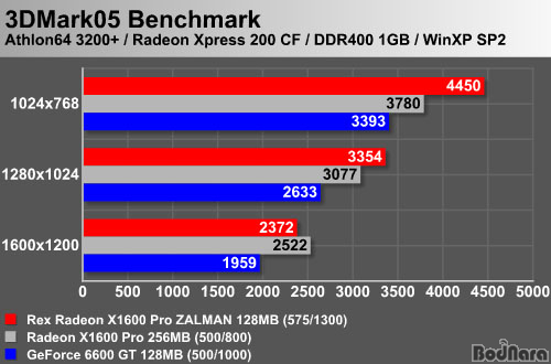 3DMark05 º¥Ä¡¸¶Å© °á°ú´Â Radeon X1600 XT ¼öÁØÀ¸·Î ¿À¹öŬ·°µÈ Rextech Radeon X1600 Pro Golden ZALMAN ±×·¡ÇÈ Ä«µå°¡ GeForce 6600 GT¸¦ Å©°Ô ¾Õ¼­´Â °á°ú¸¦ º¸¿´´Ù. ±×·¯³ª ºñµð¿À ¸Þ¸ð¸®°¡ 128MB¹Û¿¡ ¾ø¾î 1600x1200 °íÇØ»óµµ¿¡¼­´Â Ŭ·°Àº ³·Áö¸¸ ºñµð¿À ¸Þ¸ð¸®°¡ ¸¹Àº Radeon X1600 Pro 256MB Á¦Ç°¿¡ ¿ªÀüÀ» ´çÇÏ´Â Çö»óÀÌ ¹ß»ýÇß´Ù. GeForce 6600 GT 128MB´Â Radeon X1600 Pro ½Ã¸®Áî¿Í ºñ±³Çؼ­ Àü ÇØ»óµµ¿¡ °ÉÃļ­ ¶³¾îÁö´Â °á°ú¸¦ º¸¿´´Ù.