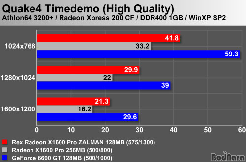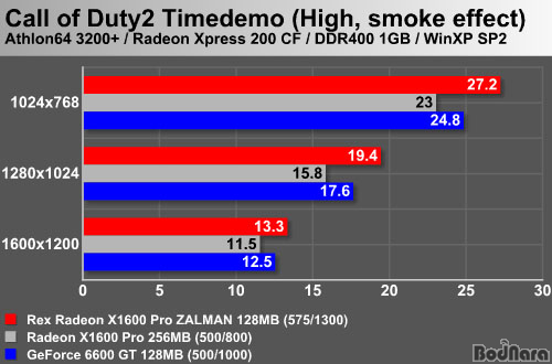 µû¶ó¼­ Call of Duty2¿¡¼­ÀÇ °á°ú´Â ±âº»ÀûÀ¸·Î´Â GeForce 6600 GT°¡ Radeon X1600 Proº¸´Ù ³ôÀ¸¸ç, Rextech Radeon X1600 Pro Golden ZALMAN Á¦Ç°ÀÇ °æ¿ì Radeon X1600 XT ¼öÁØÀÇ ¿À¹öŬ·°À¸·Î ÀÎÇØ GeForce 6600 GT¸¦ À̰å´Ù°í ºÁ¾ß ÇÒ °ÍÀÌ´Ù.