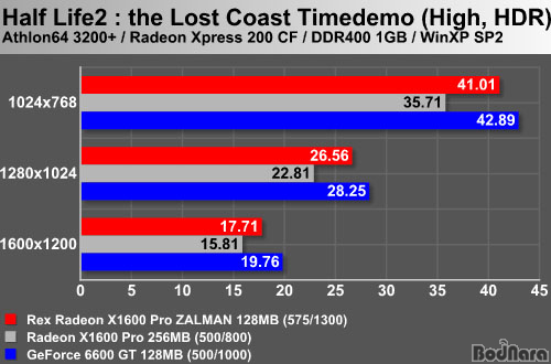 ±×·¡ÇÈ Ç°ÁúÀ» High·Î ¼³Á¤Çϰí HDR ¿É¼ÇÀ» ÄѰí ÁøÇàÇÑ Half Life2 : the Lost CoastÀÇ Å¸ÀÓµ¥¸ð Æò±Õ ÇÁ·¹ÀÓ ÃøÁ¤ °á°ú´Â GeForce 6600 GT°¡ 2Á¾·ùÀÇ Radeon X1600 Pro¸¦ ¸ðµÎ ¾Õ¼­´Â °á°ú¸¦ º¸¿´´Ù. ·¹ÆÛ·±½º Ŭ·°ÀÇ Radeon X1600 Pro 256MB´Â GeForce 6600 GTº¸´Ù Å©°Ô ¶³¾îÁö´Â °á°ú¸¦ ³ªÅ¸³Â°í, Radeon X1600 XT ¼öÁØÀ¸·Î ¿À¹öŬ·°µÈ Rextech Á¦Ç°µµ 1~2 ÇÁ·¹ÀÓ °¡·® ³·Àº °á°ú¸¦ ±â·ÏÇß´Ù.