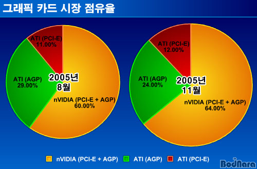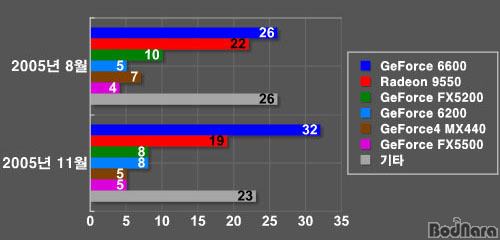 2005³â 11¿ù ÆÇ¸ÅÁý°è¿¡ µû¸£¸é Ĩ¼Âº° Á¡À¯À² 1À§´Â nVIDIAÀÇ GeForce 6600 ½Ã¸®Áî·Î Áö³ 8¿ùÀÇ 26%¿¡¼ ´õ ¿Ã¶ó°£ 32%·Î