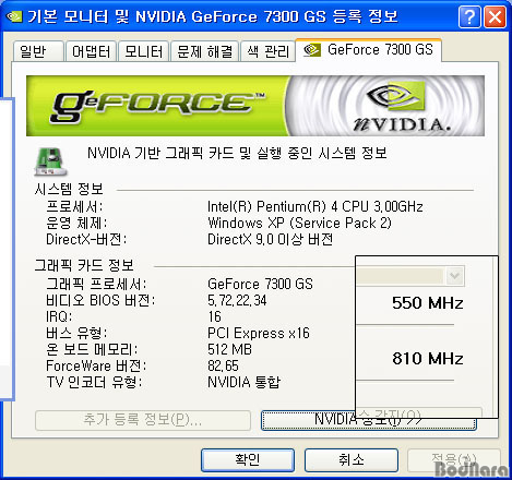 ASUS EN7300 GSÀÇ µð½ºÇ÷¹ÀÌ µî·Ï Á¤º¸¸¦ º¸¸é 128MB Á¦Ç°ÀÌÁö¸¸ Turbo Cache·Î ½Ã½ºÅÛ ¸Þ¸ð¸®¸¦ ²ø¾î¿Í¼ 512MB Á¦Ç°Ã³·³ »ç¿ëÇÒ ¼ö ÀÖ´Â °ÍÀ¸·Î Ç¥½ÃµÈ´Ù. ¸Þ¸ð¸® µ¿ÀÛ Å¬·°Àº ·¹ÆÛ·±½ºº¸´Ù ¾à°£ ³ôÀº DDR 810MHz·Î ³ªÅ¸³´Ù.
