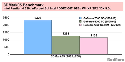 3DMark03¿¡¼´Â Å×½ºÆ®½Ã µô·¹À̰¡ »ý±â´Â ¹ö±×°¡ ¹ß»ýÇÏ¿© 3DMark05 Å×½ºÆ®¸¸À» ÁøÇàÇÏ¿´´Ù. 1024x768 ÇØ»óµµÀÇ ±âº» Å×½ºÆ® °á°ú µ¿ÀÛ Å¬·°ÀÌ ³ôÀº GeForce 7300 GS°¡ 1894Á¡À¸·Î 1100Á¡´ë¸¦ ±â·ÏÇÑ GeForce 6200 TC¿Í Radeon X300 SE H/Mº¸´Ù ³ôÀº °ÍÀ¸·Î ³ªÅ¸³µ´Ù.