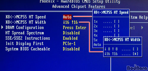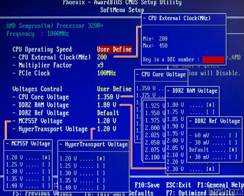 SoftMenu SetupÀÇ ¿À¹öŬ·° ±â´ÉÀº FSB Á¶Àý°ú ¹è¼ö Á¶Àý, PCI Express Ŭ·° Á¶Àý, ±×¸®°í CPU / ¸Þ¸ð¸® / Ĩ¼Â / ÇÏÀÌÆÛ Æ®·£½ºÆ÷Æ® Àü¾Ð Á¶Àý Ç׸ñÀ¸·Î ±¸¼ºµÇ¾î ÀÖ´Ù. FSB Á¶ÀýÀº 200¿¡¼­ 450±îÁö, ¹è¼ö Á¶ÀýÀº ÃÖ¼Ò 4¹è¼öºÎÅÍ CPUÀÇ ÇöÀç ¹è¼ö±îÁö 0.5X ´ÜÀ§·Î, Àü¾Ð Á¶ÀýÀº CPU Àü¾ÐÀÌ 2.1V±îÁö, ¸Þ¸ð¸® Àü¾ÐÀÌ 2.3V±îÁö, Ĩ¼Â°ú ÇÏÀÌÆÛ Æ®·£½ºÆ÷Æ® Àü¾ÐÀº 1.4V±îÁö ¿Ã¸± ¼ö ÀÖ´Ù.