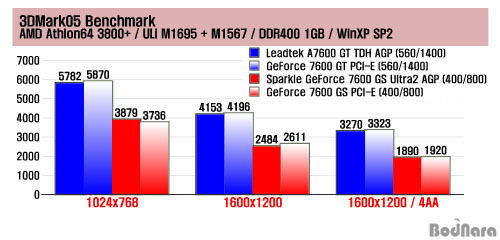 3DMark05 º¥Ä¡¸¶Å© Å×½ºÆ® °á°ú´Â °°Àº »ç¾çÀÇ PCI Express ¹öÀü Á¦Ç°µé°ú ºñ±³ÇØ ¿ÀÂ÷ ¹üÀ§¸¦ ¾à°£ ³Ñ´Â ¼öÁØÀÇ ¼º´É Â÷À̸¦ º¸¿´´Ù. ÀüüÀûÀ¸·Î AGP ¹öÀüÀÇ GeForce 7600 ½Ã¸®Áî ¼º´ÉÀÌ 50~100Á¡ °¡·® Â÷À̰¡ ³µ´Âµ¥, GeForce 7600 GS 1024x768 ÇØ»óµµ Å×½ºÆ®¿¡¼­´Â AGP ¹öÀüÀÇ Sparkle Á¦Ç°ÀÇ ¼º´ÉÀÌ ´õ ³ô°Ô ³ª¿À±âµµ Çß´Ù.