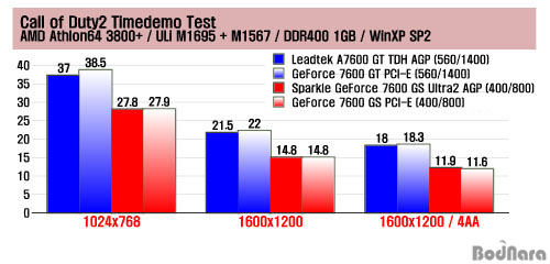 ¶Ç ´Ù¸¥ 3D FPS °ÔÀÓ Call of Duty2ÀÇ Å¸ÀÓµ¥¸ð Æò±ÕÇÁ·¹ÀÓ ÃøÁ¤ °á°ú´Â GeForce 7600 GT ÂÊÀº PCI Express 16X¿Í AGP 8XÀÇ Â÷À̰¡ 1024x768 ÇØ»óµµ¿¡¼­ ¾à°£ ³ªÅ¸³ªÁö¸¸ °íÇØ»óµµ·Î °¥¼ö·Ï ÁÙ¾îµé°í ÀÖÀ¸¸ç, GeForce 7600 GS´Â Àü ÇØ»óµµ¿¡¼­ °ÉÃÄ °ÅÀÇ ¿ÀÂ÷ ¹üÀ§ ¼öÁØÀÇ ¼º´É Â÷À̸¸À» ±â·ÏÇß´Ù.