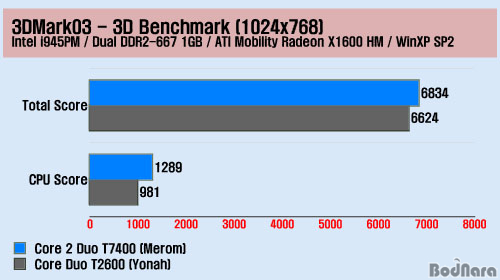½Ã½ºÅÛÀÇ 3D ¼º´ÉÀ» ÃøÁ¤ÇÒ ¼ö ÀÖ´Â 3DMark03 º¥Ä¡¸¶Å© °á°ú Àüü Á¡¼ö¿¡¼­´Â 200Á¡ °¡·®ÀÇ Â÷À̸¦ ±â·ÏÇßÀ¸¸ç CPU Á¡¼ö¿¡¼­´Â 300Á¡ÀÇ Â÷À̸¦ º¸¿´´Ù. ±×·¡ÇÈ Ä«µå°¡ ¶È°°Àº Mobility Radeon X1600 HMÀ̾ú±â ¶§¹®¿¡ ±×·¡ÇÁ¿¡ ³ªÅ¸³­ Á¡¼ö´Â ¸ðµÎ CPUÀÇ ¼º´É Â÷ÀÌ·Î ¹ß»ýÇÑ °ÍÀÌ´Ù.
