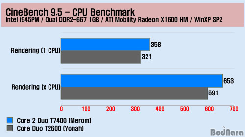 CineBench 9.5ÀÇ CPU º¥Ä¡¸¶Å© Å×½ºÆ® °á°úµµ Merom ÄÚ¾îÀÇ Core 2 Duo T7400ÀÌ °°Àº Ŭ·°À» °¡Áø Yonah ÄÚ¾î ±â¹Ý Core Duo T2600º¸´Ù ½Ì±Û°ú µà¾ó ¸ðµÎ ³ôÀº ¼º´ÉÀ» ±â·ÏÇß´Ù. ÇÏÁö¸¸ µà¾ó Äھ µû¸¥ ¼º´É Çâ»óÆøÀ» ºñ±³Çϸé Core 2 Duo T7400Àº 1.82¹è, Core Duo T2600Àº 1.84¹è·Î CPU ÄÚ¾îÀÇ ±âº» ¼º´É Â÷À̰¡ À¯ÁöµÇ°í ÀÖ´Â °ÍÀÌÁö µà¾ó Äھ¼­ÀÇ È¿À²ÀÌ ´õ ³ô¾ÆÁø °á°ú´Â ¾Æ´Ï´Ù.
