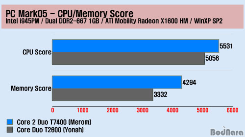 PCMark05ÀÇ CPU¿Í ¸Þ¸ð¸® ¼º´É Å×½ºÆ®µµ Core 2 Duo T7400ÀÇ °á°ú°¡ ³ô°Ô ³ª¿Ô´Ù. RightMark Memory Analyzer¿Í ¸¶Âù°¡Áö·Î ¸Þ¸ð¸® Á¡¼ö Â÷À̰¡ CPU Â÷À̺¸´Ù Å©´Ù. °°Àº µà¾ó ä³Î DDR2-667 ¸Þ¸ð¸® ±¸¼º¿¡¼­ ÀÌ Á¤µµÀÇ Â÷À̰¡ ÀÖ´Ù¸é ³»³â ÃÊ¿¡ µîÀåÇÏ´Â Santa Rosa Ç÷§Æû¿¡¼­ FSB 800MHz¿Í µà¾ó ä³Î DDR2-800À» ±¸¼ºÇÏ¸é ¸Þ¸ð¸® ¼º´ÉÀ» ´õ¿í ²ø¾î¿Ã¸± ¼ö ÀÖÀ» °ÍÀ¸·Î ±â´ëµÈ´Ù.