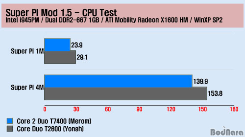 CPUÀÇ ½ÇÁ¦ ¿¬»ê ¼º´ÉÀ» Å×½ºÆ®ÇÒ ¼ö ÀÖ´Â Super Pi Mod 1.5 ¹öÀüÀÇ Å×½ºÆ® °á°ú 1M¿¡¼­ 5ÃÊ °¡·®, 4M Å×½ºÆ®¿¡¼­ 14ÃÊ Á¤µµ Core 2 Duo T7400ÀÌ ºü¸¥ °ÍÀ¸·Î ³ªÅ¸³µ´Ù. ¼º´É Â÷À̰¡ ¹ú¾îÁø ÀÌÀ¯´Â ¾ÆÅ°ÅØÃÄÀÇ Â÷ÀÌ¿Í L2 ij½Ã ¿ë·® ¶§¹®ÀÎ °ÍÀ¸·Î º¸ÀδÙ.