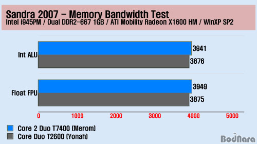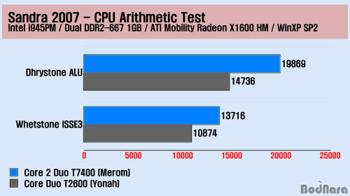 Sandra 2007ÀÇ CPU Arithmetic Å×½ºÆ® °á°ú °°Àº Ŭ·°°ú FSB¸¦ Áö¿øÇÔ¿¡µµ ºÒ±¸Çϰí Core 2 Duo T7400ÀÇ ¼º´ÉÀÌ Å©°Ô ¾Õ¼­´Â °ÍÀ¸·Î ³ªÅ¸³µ´Ù. Core Duo ¿ª½Ã ÀÌÀü ¸ðµ¨À̾ú´ø Pentium M¿¡ ºñÇØ ºñ¾àÀûÀÎ Çâ»óÀ» °¡Á®¿ÔÀ¸³ª, ´õ °­È­µÈ ¾ÆÅ°ÅØÃÄ¿Í 2¹è·Î Áõ°¡ÇÑ L2 ij½Ã·Î ¹«ÀåÇÑ Core 2 Duo ¾Õ¿¡¼­´Â ÇÑ¹ß ¹°·¯³­ ¸ð½ÀÀÌ´Ù.