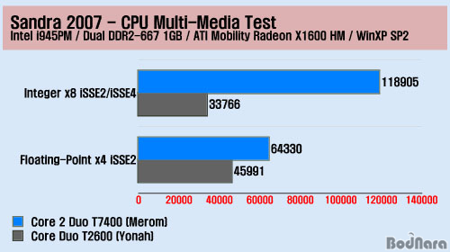 Sandra 2007ÀÇ CPU Multimedia Å×½ºÆ® °á°ú´Â ´õ Ȳ´çÇѵ¥ Integer x8 °á°ú°¡ 3¹è¸¦ ³Ñ¾î°¡±â ¶§¹®ÀÌ´Ù. ÀÌ´Â Core 2 Duo°¡ SSE4¸¦ Áö¿øÇϰí ÀÖ¾î °°Àº Å×½ºÆ®Áö¸¸ Core 2 Duo T7400Àº Integer x8 SSE4·Î, SSE3±îÁö¸¸ Áö¿øÇÏ´Â Core Duo T2600Àº Integer x8 SSE2 ¸ðµå·Î ÃøÁ¤µÇ¾ú±â ¶§¹®ÀÌ´Ù. °°Àº Floating Point x4 SSE4·Î µ¹¾Æ°£ Å×½ºÆ®¿¡¼­µµ Core 2 Duo T7400ÀÇ °á°ú°¡ ¾Õ¼­´Â °ÍÀ¸·Î ³ª¿Ô´Ù.