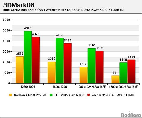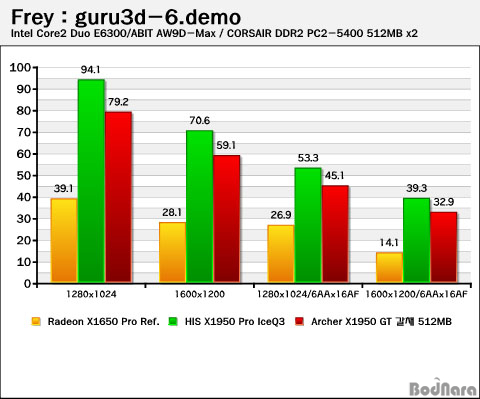 °ÔÀÓ³»ÀÇ ¼³Á¤Àº AA/AF¸¦ Á¦¿ÜÇÑ ¸ðµç Ç׸ñÀ» ÃÖ´ë·Î ¼³Á¤ÇÏ¿´À¸¸ç ±×·¡ÇÈ ºÎ½ºÆ® ±â´ÉÀº Ȱ¼ºÈÇÏ¿´´Ù. Archer X1950 GT °¥Ã¤ 512MB°¡ X1950 Pro¿Í µ¿ÀÏÇÑ »ç¾ç (36°³ÀÇ ÇȽ© ¼ÎÀÌ´õ ÇÁ·Î¼¼¼, 8°³ÀÇ ¹öÅØ½º ¼ÎÀÌ´õ ÆÄÀÌÇÁ¶óÀÎ, 16°³ÀÇ Çȼ¿ ÆÄÀÌÇÁ¶óÀÎ ¼ö)¸¦ °®Ãß°í Àֱ⠶§¹®¿¡ ÇØ»óµµ ¹× AA/AF ¼³Á¤½Ã¿¡ µ¿ÀÛŬ·°ÀÇ Â÷À̸¸ÅÀÇ ¼º´É Â÷À̸¦ º¸¿©ÁÖ°í ÀÖ´Ù. ´Ù¸¸ µ¥ÀÌÅÍ Ã³¸®·®ÀÌ ¸¹¾Æ Áú¼ö·Ï 256MB¿ë·®ÀÇ X1950 Pro¿¡ ºñÇØ ¼º´É °¨¼ÒÆøÀÌ Àû´Ù´Â Á¡ÀÌ ÁÖ¸ñÇÒ¸¸ ÇÏ´Ù. ¡¡