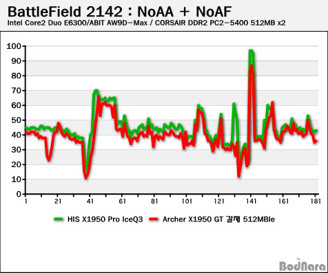 ÇϹݱâ ÃÖ°íÀÇ ±â´ëÀÛÁß¿¡ ÇϳªÀÎ ¹èƲÇʵå2142ÀÇ °æ¿ì ½Ì±ÛÇ÷¹ÀÌ ¹× ÃÖ´ë 64¸í ¿Â¶óÀÎÇ÷¹À̸¦ Áö¿øÇÏ´Â °ÔÀÓÀ¸·Î À̹ø Å×½ºÆ®´Â Fall Of Berlin ¸Ê¿¡¼ º¸º´À¸·Î ÀüÅõ¸¦ ÇÏ´Ù Áß¾ÓÁö¿ª¿¡¼ ¸ÞÄ«´ÐÀ¸·Î °¥¾ÆÅ¸ Àû°ú ÀüÅõ¸¦ ÇÏ´Ù ÀÚµ¿Â÷·Î °¥¾ÆÅ¸ À̵¿ÇÏ´Â Àå¸éÀ» ¾à 3ºÐµ¿¾È Fraps¸¦ ÀÌ¿ëÇÏ¿© ÇÁ·¹ÀÓ ÃøÁ¤À» ÇÏ¿´´Ù. Archer X1950 GT °¥Ã¤ 512MBÀÇ °æ¿ì ÃÊ¹Ý ½Ã³»·Î À̵¿ÇÏ¸é¼ Àû°ú Á¶¿ì½Ã½Ã¿¡´Â 35~45 ÇÁ·¹ÀÓÀ» º¸¿©ÁÖ¾úÀ¸¸ç ¸ÞÄ«´ÐÀ» ź ÈÄ 65ÇÁ·¹ÀÓ±îÁö »ó½ÂÇÏ´Ù°¡ ÀüÅõ¸¦ ¹úÀÌ¸é ±Þ°ÝÇÑ ÇÁ·¹ÀÓ °¨¼Ò°¡ ÀÌ·ïÁö°í ÀÖÀ¸¸ç ¶§·Î´Â 10ÇÁ·¹ÀÓ±îÁö ¶³¾îÁö´Â ¸ð½ÀÀ» º¸¿©ÁØ´Ù. ÀÌÈÄ¿¡ ÀÚµ¿Â÷·Î °¥¾ÆÅº ÈÄ ½Ã³»¸¦ ºü¸¥¼Óµµ·Î À̵¿ÇÒ °æ¿ì¿¡´Â 20~60 ÇÁ·¹ÀÓ»çÀ̸¦ ¿Ô´Ù°¬´ÙÇÏÁö¸¸ ½ÇÁ¦ Ç÷¹À̽ÿ¡´Â ²÷±è µîÀÇ Çö»óÀ» ¹ß»ýÇÏÁö ¾Ê´Â´Ù. HIS¿Í ºñ±³ÇÏ¿© ÀüüÀûÀ¸·Î 2~4 ÇÁ·¹ÀÓÀÇ ÀúÇϸ¦ º¸¿©ÁÖÁö¸¸ HIS°¡ ÃÖ¼Ò 30ÇÁ·¹ÀÓ ÀÌ»óÀÇ ²ÙÁØÇÑ ÇÁ·¹ÀÓÀ» º¸¿©ÁÖ´Â °Í°ú ´Ù¼Ò Â÷À̸¦ º¸¿©ÁÖ°í ÀÖ´Ù. Å×½ºÆ® °á°ú ½Ì±ÛÇ÷¹À̽ÿ¡ ÇÑÁ¤µÇ¾úÁö¸¸ ´Ù¼öÀÇ Àû°ú Àåºñ°¡ µ¿¿øµÇ´õ¶ó°í ÄèÀûÇÑ Ç÷¹À̰¡ °¡´ÉÇÏ¿´´Ù.