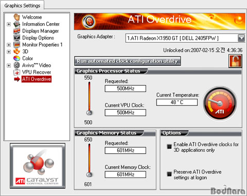 X1950 GT¿¡ Àû¿ëµÇ´Â ·¹ÆÛ·±½º Ŭ·°Àº 3D ¸ðµå¿¡¼ ÄÚ¾î 500MHz, ¸Þ¸ð¸®´Â 1200(600)MHzÀε¥, Catalyst Control Center¿¡¼ Àû¿ëµÇ°í Àִ Ŭ·°Àº ÄÚ¾î 500MHz, ¸Þ¸ð¸® 601MHz·Î ÀÏÄ¡Çϰí ÀÖ´Ù. AA ¹× AF ¼³Á¤Àº °ÔÀÓ³»ÀÇ ¼³Á¤À» ÇÏÁö ¾Ê°í µå¶óÀ̹ö³»ÀÇ 3D ¼³Á¤ Ç׸ñ¿¡¼ °¢°¢ Ȱ¼ºÈÇÑÈÄ Å×½ºÆ®¸¦ ÁøÇàÇÏ¿´´Ù. ¡¡