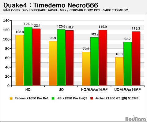 ±×·¡ÇÈÄ«µåÀÇ 3D ¼º´É ÃøÁ¤¿¡ °¡À帹ÀÌ »ç¿ëµÇ´Â °ÔÀÓÀÎ Quake4¸¦ ÀÌ¿ëÇÏ¿© ½ÇÁ¦ °ÔÀÓ Ç÷¹À̽ÃÀÇ Ã¼°¨ ¼º´ÉÀ» »ìÆìº¸¾Ò´Ù. µà¾óÄھ Ȱ¼ºÈµÇµµ·Ï ÄÜ¼Ö ¸í·É¾î¸¦ ³Ö¾îÁÖ¾úÀ¸¸ç °ÔÀÓ³»ÀÇ ¼³Á¤Àº High Quality ¿Í Ultra High QualityÀÇ µÎ°¡Áö ¸ðµå¸¦ ¼±ÅÃÇÏ¿´´Ù. À̹ۿ¡ AA / AF ¼³Á¤Àº µå¶óÀ̹ö ³»¿¡¼ Àû¿ëÈÄ ÁøÇàÇÏ¿´´Ù. Å×½ºÆ® °á°ú¸¦ »ìÆìº¸¸é AA/AF¸¦ Àû¿ëÇÏÁö ¾Ê¾ÒÀ» ¶§¿¡´Â Archer X1950 GT °¥Ã¤ 512MB°¡ ±Ù¼ÒÇÑ Â÷ÀÌ·Î HIS¿¡ µÚÃÄÁö°í ÀÖÁö¸¸ ÀÌÀü Å×½ºÆ®¿Í´Â ´Þ¸® ±× Â÷ÀÌ´Â ¸Å¿ì ÀûÀº ÆíÀÌ´Ù. ±×·±µ¥ 6xAA/16xAF¸¦ ¼³Á¤ÇÏ°Ô µÇ¸é Archer X1950 GT °¥Ã¤ 512MB´Â ¾ÆÁÖ ¾ÆÁÖ ÀûÀº ÇÁ·¹ÀÓ °¨¼Ò°¡ ÀϾ´Â ÇÑÆí HIS´Â ¾à 20% ÀÌ»óÀÇ ÇÁ·¹ÀÓ Ç϶ôÀ» º¸¿©ÁÖ°í ÀÖ´Ù. ƯÈ÷ Ultra HIgh QualityÀÇ °æ¿ì 512MB ÀÌ»óÀÇ ±×·¡ÇÈ ¸Þ¸ð¸®¸¦ ¿ä±¸ÇÏ¸ç ¸¸¾à À̺¸´Ù ÀûÀº ¿ë·®ÀÏ °æ¿ì Çϵåµð½ºÅ©µîÀÇ ½º¿ÒÀ» ÅëÇØ µ¥ÀÌÅ͸¦ ó¸®Çϱ⠶§¹®¿¡ »ó´ëÀûÀ¸·Î ÇÁ·¹ÀÓÀÌ ¶³¾îÁö°Ô µÈ´Ù. ±× °á°ú ´õ ³ôÀº µ¿ÀÛ Å¬·°À» °®°í ÀÖÀ¸¸é¼µµ ¿ÀÈ÷·Á Archer X1950 GT °¥Ã¤ 512MB°¡ ³ôÀº ¼º´ÉÀ» Á¦°øÇÏ´Â À̺¯À» º¸¿©ÁÖ°Ô µÈ´Ù.
