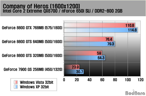 Company of HerosÀÇ Å×½ºÆ® °á°ú´Â 3DMark06°ú ¸¶Âù°¡Áö·Î À©µµ¿ì XP¿¡¼­ Å×½ºÆ®ÇÑ ÂÊÀÌ ³ôÀº °á°ú¸¦ ³ªÅ¸³Â´Ù. ÇÏÁö¸¸ Forceware 100.65 µå¶óÀ̹ö¸¦ »ç¿ëÇÑ GeForce 8800 ÂÊÀÌ 97.43 º£Å¸ µå¶óÀ̹ö¸¦ ¾´ GeForce 7900 GSº¸´Ù ¼º´É Â÷ÀÌ´Â ´õ ÁÙ¾îµç ¸ð½ÀÀÌ´Ù.