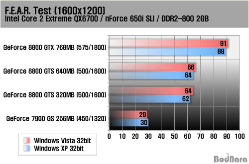 F.E.A.R. Å×½ºÆ® °á°ú´Â À©µµ¿ì ºñ½ºÅ¸¿¡¼­ÀÇ GeForce 8800 ½Ã¸®Áî°¡ À©µµ¿ì XP¿¡¼­º¸´Ù ¼º´ÉÀÌ ´õ ³ô°Ô ³ª¿Ô´Ù. GeForce 7900 GSÀÇ °æ¿ì ºñ½ºÅ¸¿¡¼­ÀÇ ¼º´ÉÀÌ ´õ ³·¾ÒÁö¸¸, µå¶óÀ̹ö ¹®Á¦·Î GeForce 8800°ú °°Àº 100.65 Á¤½Ä µå¶óÀ̹ö¸¦ ¾²Áö ¸øÇϰí 97.43 º£Å¸ µå¶óÀ̹ö¸¦ ½è±â ¶§¹®¿¡ ¼º´ÉÀÌ ³·°Ô ³ª¿Â °ÍÀÏ ¼öµµ ÀÖ´Ù. 1600x1200 ¿Ü¿¡ °íÇØ»óµµ¿Í 4AA/8AF °á°ú ¸ðµÎ À©µµ¿ì ºñ½ºÅ¸ ÂÊÀÇ ¼º´ÉÀÌ ´õ ³ô¾Ò´Ù.