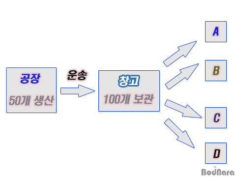 ¿ì¼± À̹ÌÁö¸¦ º¸ÀÚ. ÇÑ È¸»çÀÇ Ã¢°í¿¡´Â ÃÑ 100°³ÀÇ ¹°°ÇÀÌ º¸°üµÇ¾î ÀÖ´Ù°í ÇÏÀÚ. À̶§, A/ B/ C/ D¶ó´Â »ç¶÷µéÀÌ ÀÖ°í ÀÌ »ç¶÷µé¿¡°Ô ¹°°ÇÀ» ÇÊ¿äÇÑ ¸¸Å­ °ø±ÞÇØÁÖ¾î¾ß ÇÑ´Ù. ±×·±µ¥ ÀÌ ³× »ç¶÷µéÀº °øÀå¿¡¼­ ¿î¼ÛÇÏ´Â 50°³¸¸ °¡Áö°í ºÐ¹è°¡ °¡´ÉÇÏ´Ù°í ÇÏÀÚ. (A°¡ 15°³, B´Â 12°³, C´Â 10°³, D´Â 13°³¸¦ °¢°¢ ÇÊ¿äÇÏ¿© ÃÑ 50°³¸¸ ÀÖÀ¸¸é µÈ´Ù.)À̶§´Â â°í¿¡´Â °è¼Ó 100°³¸¦ ¿©À¯¹°·®À¸·Î º¸°üÇØ³õ°í, °øÀå¿¡¼­ ¿îµ¿µÇ´Â 50°³¸¸ °¡Áö°í ¿øÇÏ´Â ¼ö¿ä¿¡ ¸Â°Ô ÃæºÐÇÏ°Ô °ø±ÞÇØÁÙ ¼ö ÀÖ´Ù. (¹°·Ð FIFO, ¼±ÀÔ¼±Ãâ¹æ½ÄÀÌ´Ù)
