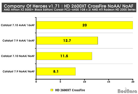 À̹ø¿¡´Â HD 2600XT¸¦ CrossFire ±¸¼ºÇÏ¿´À» ¶§ Company Of Heroes °ÔÀÓ¿¡¼­ÀÇ ¼º´É Çâ»ó ºñÀ²À» È®ÀÎÇÏ¿© º¸¾Ò´Âµ¥ ¾Õ¼­ »ìÆìº» ¹Ù·Î´Â ÀÌ °ÔÀÓ¿¡¼­ CrossFire¸¦ HD 2000 ½Ã¸®Áî ±×·¡ÇÈ Ä«µå·Î ±¸¼ºÇÏ¿´À» ¶§ ÃÖ´ë 80%ÀÇ ¼º´É Çâ»óÀ» º¸¿©ÁØ´Ù°í ¾ð±ÞµÇ°í ÀÖ´Ù. ¾ð¶æ º¸±â¿£ ÃÖ´ëÀ̹ǷΠ¹®Á¦µÉ °ÍÀº ¾ø¾î º¸ÀÌÁö¸¸, ½ÇÁ¦ Çâ»ó ºñÀ²À» º¸¸é ¾à°£ °úÀåµÈ ¼öÄ¡¸¦ Ç¥±âÇϰí ÀÖÁö ¾Ê³ª »ý°¢µÈ´Ù.