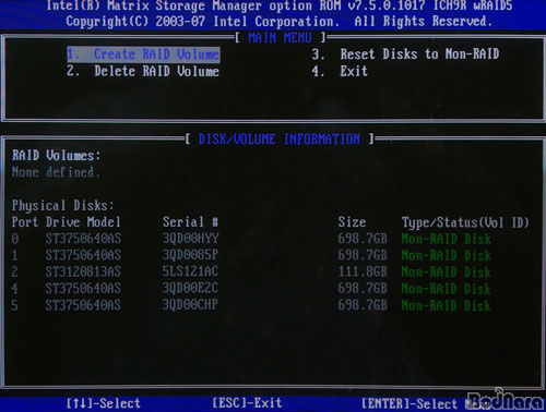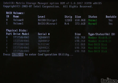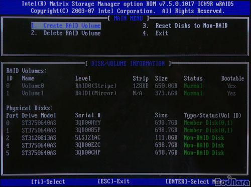 RAID 0, 1, 10, 5·Î ÃÑ 4°¡ÁöÀε¥, ÀÎÅÚ ICH¿¡ µé¾î°¡´Â Matrix RAID´Â º°µµÀÇ RAID Level ¸Þ´º°¡ ¾Æ´Ï¶ó µå¶óÀ̺ê