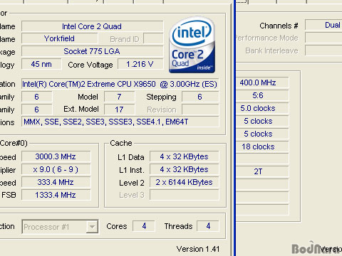 CPU-Z 1.41¹öÀüÀ» ÅëÇØ È®ÀÎµÈ QX9650Àº QX6850°ú ºñ±³ÇÏ¿© 8MB¿¡¼ 12MB·Î ´Ã¾î³ L2 ij½¬¸¦