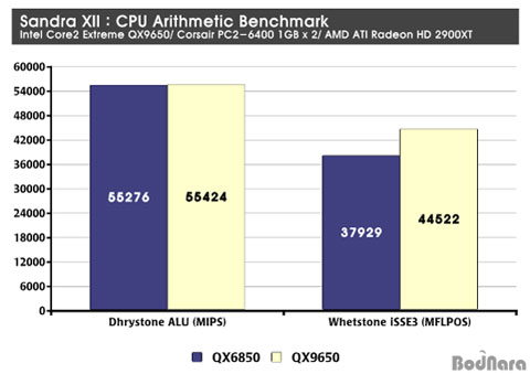 Whetstone iSSE3¿¡¼´Â ±âÁ¸ QX6850°ú ºñ±³ÇÏ¿© 17.38%ÀÇ ¼º´É Çâ»óÀÌ QX9650¿¡¼ ³ªÅ¸³ª°í ÀÖ´Â