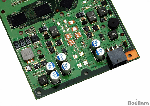 Àü¿øºÎÀÇ ¸éÀûÀº ±âÁ¸ 8800 ½Ã¸®Áî¿Í Å«Â÷À̰¡ ¾øÁö¸¸ ÀÚ¼¼È÷ º¸¸é Áß¾Ó ºÎºÐ¿¡ Àü¿øºÎ°¡ ÀåÂøµÇ´Â °ø°£ÀÌ ºñ¾î ÀÖÀ¸¸ç °á±¹ 8800GTSº¸´Ù ³·Àº 2Phase¿Í 1PhaseÀÇ ±¸¼ºÀ» Çϰí ÀÖ´Â °ÍÀ» È®ÀÎÇÒ ¼ö ÀÖ´Ù. ÀÌ´Â 8800GT°¡ ³·¾ÆÁø ¼ÒºñÀü·ÂÀ» °®Ãß°í Àֱ⠶§¹®À̶ó°í º¼ ¼ö ÀÖÀ¸¸ç Ãß°¡ Àü¿ø °ø±ÞÀ» À§ÇØ 8800GTS¿Í µ¿ÀÏÇÏ°Ô 6ÇÉ Àü¿ø Ä¿³ØÅÍ 1°³¸¸ÀÌ Á¦°øµÇ°í ÀÖ´Ù.