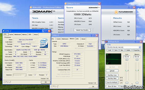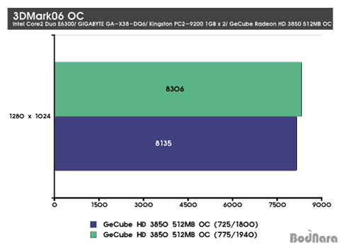GeCube HD 3850 X-Turbo III OC Edition DDR3 512MB¸¦ ÄÚ¾î 775/ ¸Þ¸ð¸® 1940 (970)MHz·Î ¿À¹öŬ·°À» ÁøÇàÇÑ ÈÄ E6300 CPU ¿ª½Ã ±âº»¿¡¼­ FSB 460 x 7 (3220MHz), ½Ã½ºÅÛ ¸Þ¸ð¸® Ŭ·° DDR2 1150 (575)MHz¸¦ Àû¿ëÇÑ ÈÄ 3DMark06ÀÇ ¼º´ÉÀ» È®ÀÎÇØ º¸¾Ò´Ù. Å×½ºÆ® °á°ú E6300ÀÇ ±âº» 1860MHz¿Í DDR2 800MHzÀÇ 8306ÀÇ ½ºÄھ´Ù ³ôÀº 10999¸¦ ±â·ÏÇß´Ù.