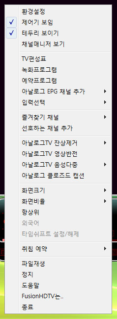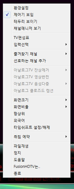 TV½ÃûÁß¿¡ È­¸é¿¡¼­ ¸¶¿ì½º ¿À¸¥ÂÊ ¹öưÀ» Ŭ¸¯Çϸé ȯ°æ ¼³Á¤À» ºñ·ÔÇÑ ´Ù¾çÇÑ ¿É¼ÇÀ» ¼±ÅÃÇÒ ¼ö ÀÖ´Â ÆË¾÷âÀÌ ¶ß°Ô µÇ´Âµ¥, µðÁöÅÐ ¹æ¼Û°ú ¾Æ³¯·Î±× ¹æ¼Û¿¡ µû¶ó ±× ±¸¼º¿¡µµ ¾à°£ÀÇ Â÷À̸¦ º¸ÀÌ°Ô µÈ´Ù.