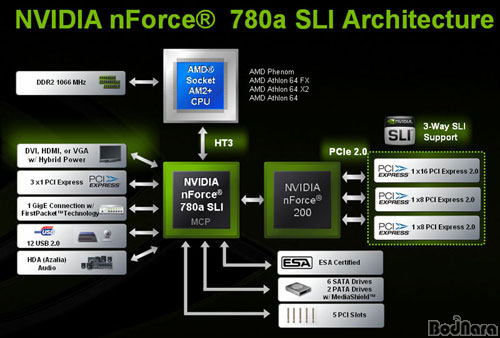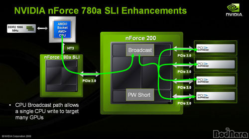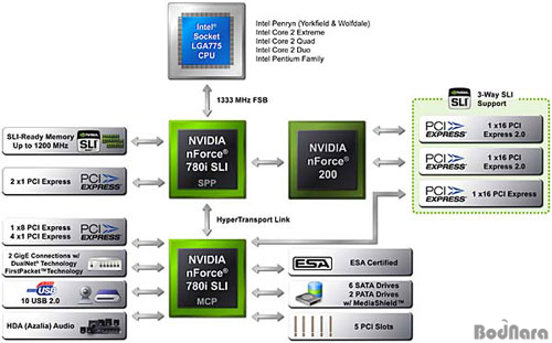 SLI¿¡´Â ÀÏ¹Ý SPP + MCP ±¸Á¶¿¡ PCI Express 2.0À» À§ÇÑ ¿£Æ÷½º 200À» Ãß°¡ÇÏ´Â ¹æ½ÄÀ» ÅÃÇß´Ù. ¸ÞÀκ¸µå ¼³°è Á¦Á¶¿¡