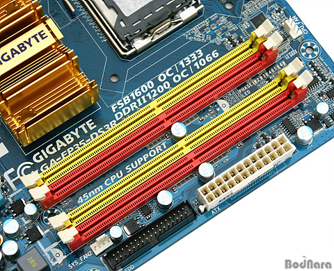 DDR2-800/667 ±Ô°ÝÀ» Áö¿øÇÏ¸ç ¿À¹öŬ·°À» ÅëÇØ DDR2-1200 ±Ô°Ý±îÁö Áö¿øÀÌ °¡´ÉÇÏ´Ù. 4°³ÀÇ DIMM ½½·ÔÀ» ÅëÇØ ÃÖ´ë 8GB±îÁö ¸Þ¸ð¸® ¿ë·®À» Á¦°øÇÏ¸ç ¼ÒÄÏ »ö»óÀ» ³ë¶õ»ö°ú ºÓÀº»öÀ¸·Î ±¸ºÐÇØ µ¿ÀÏÇÑ »ö»óÀÇ ¼ÒÄÏ¿¡ ¸Þ¸ð¸®¸¦ °¢°¢ ÀåÂøÇÏ¸é µà¾ó ä³Î·Î µ¿ÀÛÀÌ °¡´ÉÇϵµ·Ï µÇ¾î ÀÖ´Ù.