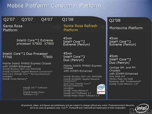 °ø½Ä ¸íĪÀº 'ÀÎÅÚ ¼¾Æ®¸®³ë 2'ÀÎ ¸óÅ׺ñ³ª Ç÷§ÆûÀº ¿Ã 6¿ù¿¡ ¿­¸®´Â ÄÄÇ»µ¦½º 2008À» ÅëÇØ ±× ¸ð½ÀÀ» µé¾î³¾ ¿¹Á¤ÀÌ´Ù. 45nm °øÁ¤ÀÇ PenrynÀ» ±×´ë·Î À¯ÁöÇϸ鼭 ÄÚµå¸í ĭƼ°¡ÀÎ GM45, GM47, PM45¸¦ »ç¿ëÇÒ °ÍÀ¸·Î ¿¹»óµÈ´Ù. ƯÈ÷ ³»Àå ±×·¡ÇÈ ÄÚ¾î´Â ¼ÖÁ÷È÷ ±× µ¿¾È ¸¹Àº ¿åÀ» ¸Ô¾ú´ø GMA X3100ÀÇ ¾÷±×·¹ÀÌµå ¹öÀü GMA X4500À» »ç¿ëÇØ DX10 Áö¿ø ¹× ¼º´ÉÀÇ »ó½Âµµ ¿¹Á¤µÇ¾î ÀÖ¾î ±× ±ÍÃß°¡ ÁÖ¸ñµÈ´Ù.