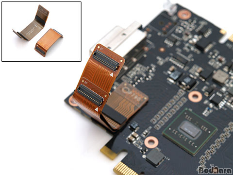 GX2¿Í ´Þ¸® CrossFire ÄÉÀ̺í°ú °°Àº º¯ÇüÀÌ ÀߵǴ Çʸ§ÇüÅÂÀÇ ÄÉÀ̺íÀÌ 2°³ÀÇ PCB¸¦ ¿¬°áÇϰí ÀÖ´Ù.