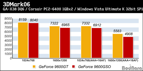 GeForce 9600GSO´Â 96°³ÀÇ ½ºÆ®¸² ÇÁ·Î¼¼¼­¸¦ °®Ãß°í ÀÖÁö¸¸ 192bit ¸Þ¸ð¸® ÀÎÅÍÆäÀ̽º, 12°³ÀÇ ROP¸¦ °¡Á® GeForce 9600GT¿¡ ºñÇØ ¼º´É ÀúÇϰ¡ ¹ß»ýµÉ °ÍÀ¸·Î ¿¹»óµÇ´Âµ¥, ½ÇÁ¦ 3DMark06 Å×½ºÆ® °á°ú¸¦ »ìÆìº¸¸é ÇØ»óµµ Áõ°¡ ¹× ÇÊÅ͸µ Àû¿ë½Ã ¸ðµÎ GeForce 9600GT°¡ ¾Õ¼­´Â ¸ð½ÀÀ» º¸¿©ÁÖ°í ÀÖ´Ù. ƯÈ÷ Å×½ºÆ®Áß ±×·¡ÇÈÄ«µå¿¡ °¡Àå Å« ºÎÇϰ¡ °É¸®´Â 1600x1200/4xAA+16xAF Àû¿ë½Ã¿¡´Â µÑ »çÀÌ¿¡ 13% °¡·®ÀÇ ¼º´É Â÷À̸¦ º¸À̰í Àִµ¥, ÀÌ´Â µ¥ÀÌÅÍ Ã³¸®·®ÀÌ Áõ°¡ÇÒ¼ö·Ï ¸Þ¸ð¸® ´ë¿ªÆø Á¦ÇÑÀ¸·Î ÀÎÇØ GeForce 9600GSO°¡ Á¦´ë·ÎµÈ ¼º´ÉÀ» º¸¿©ÁÖÁö ¸øÇÏ´Â °ÍÀ¸·Î º¼ ¼ö ÀÖ´Ù.