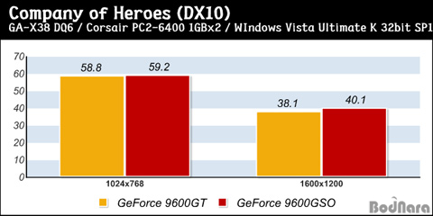 Company OF Heroes(ÀÌÇÏ COH)´Â V1.71 ÆÐÄ¡¸¦ Àû¿ëÇØ DX10 ¸ðµå·Î µ¿ÀÛ½ÃŲ ÈÄ Å×½ºÆ®¸¦ ÁøÇàÇÏ¿´À¸¸ç ¸ðµç ±×·¡ÇÈ ¿É¼ÇÀ» High·Î ¼³Á¤ÇÏ¿´´Ù. °á°ú¿¡¼­ º¸µíÀÌ ¾Õ¼­ 3DMark06ÀÇ Å×½ºÆ® °á°ú¿Í´Â ´Ù¸£°Ô ±Ù¼ÒÇÑ Â÷ÀÌÁö¸¸ GeForce 9600GSO°¡ ¾Õ¼± ¸ð½ÀÀ» º¸¿©ÁÖ°í ÀÖÀ¸¸ç °íÇØ»óµµ¿¡¼­µµ µ¿ÀÏÇÏ°Ô À¯ÁöµÇ°í ÀÖ´Ù.