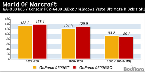 ¸¶Áö¸·À¸·Î ¿Â¶óÀÎ °ÔÀÓÀÎ World Of Warcraft(ÀÌÇÏ WOW)ÀÇ °á°ú¸¦ »ìÆìº¸µµ·Ï ÇÏÀÚ. ÇÊÅ͸µÀ» Àû¿ëÇÏÁö ¾Ê¾ÒÀ» °æ¿ì¿¡´Â GeForce 9600GSO°¡ GeForce 9600GT¸¦ ¾Õ¼­´Â¸ð½ÀÀ»º¸¿©ÁÖ°í Àִµ¥, 8x ¸ÖƼ»ùÇøµÀ» Àû¿ëÇÏ¿´À» ¶§¿¡´Â Á¤ ¹Ý´ëÀÇ °á°ú¸¦ º¸¿©ÁÖ°í ÀÖ´Ù. ÀÌ´Â ±×·¡ÇÈÄ«µå¿¡¼­ ó¸®ÇؾßÇÏ´Â µ¥ÀÌÅͰ¡ ±ÞÁõÇÒ¼ö·Ï ½ºÆ®¸² ÇÁ·Î¼¼¼­ÀÇ °³¼öº¸´Ù´Â ¸Þ¸ð¸® ´ë¿ªÆøÀÌ ¼º´ÉÇâ»óÀÌ ´õ Å« ¿ªÇÒÀ» Çϰí ÀÖÀ¸¸ç °á±¹ GeForce 9600GSO´Â ¸Þ¸ð¸® ´ë¿ªÆø¿¡ ¹ß¸ñÀÌ ÀâÇô Å« ¼º´É Ç϶ôÀ» º¸¿©ÁÖ°í ÀÖ´Ù.