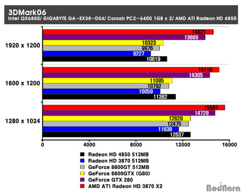 3DMark06 º¥Ä¡¸¶Å© Å×½ºÆ®¿¡¼ HD 4850Àº ±âÁ¸ HD 3870ÀÌ À§Ä¡Çϰí ÀÖ´ø ÀÚ¸®·Î