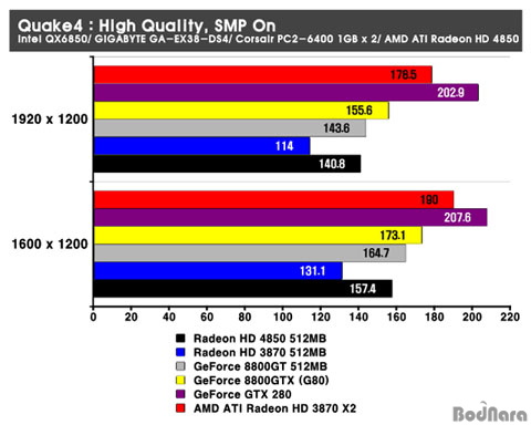 Quake4ÀÇ °æ¿ì ÀüÅëÀûÀ¸·Î NVIDIA Á¦Ç°µéÀÌ ¿ì¼öÇÑ ¼º´ÉÀ» º¸¿©ÁÖ¾ú´Âµ¥ HD 4850Àº